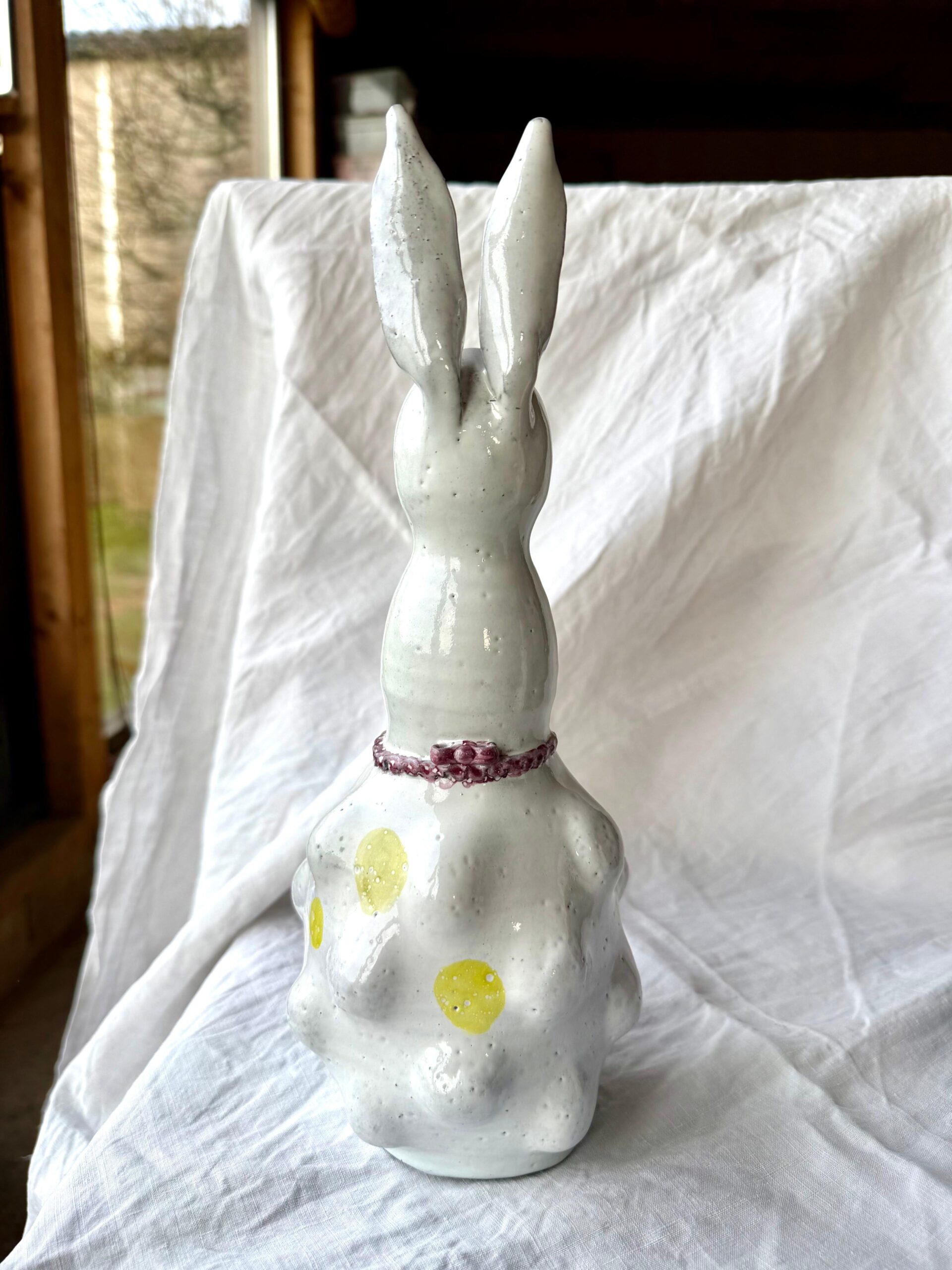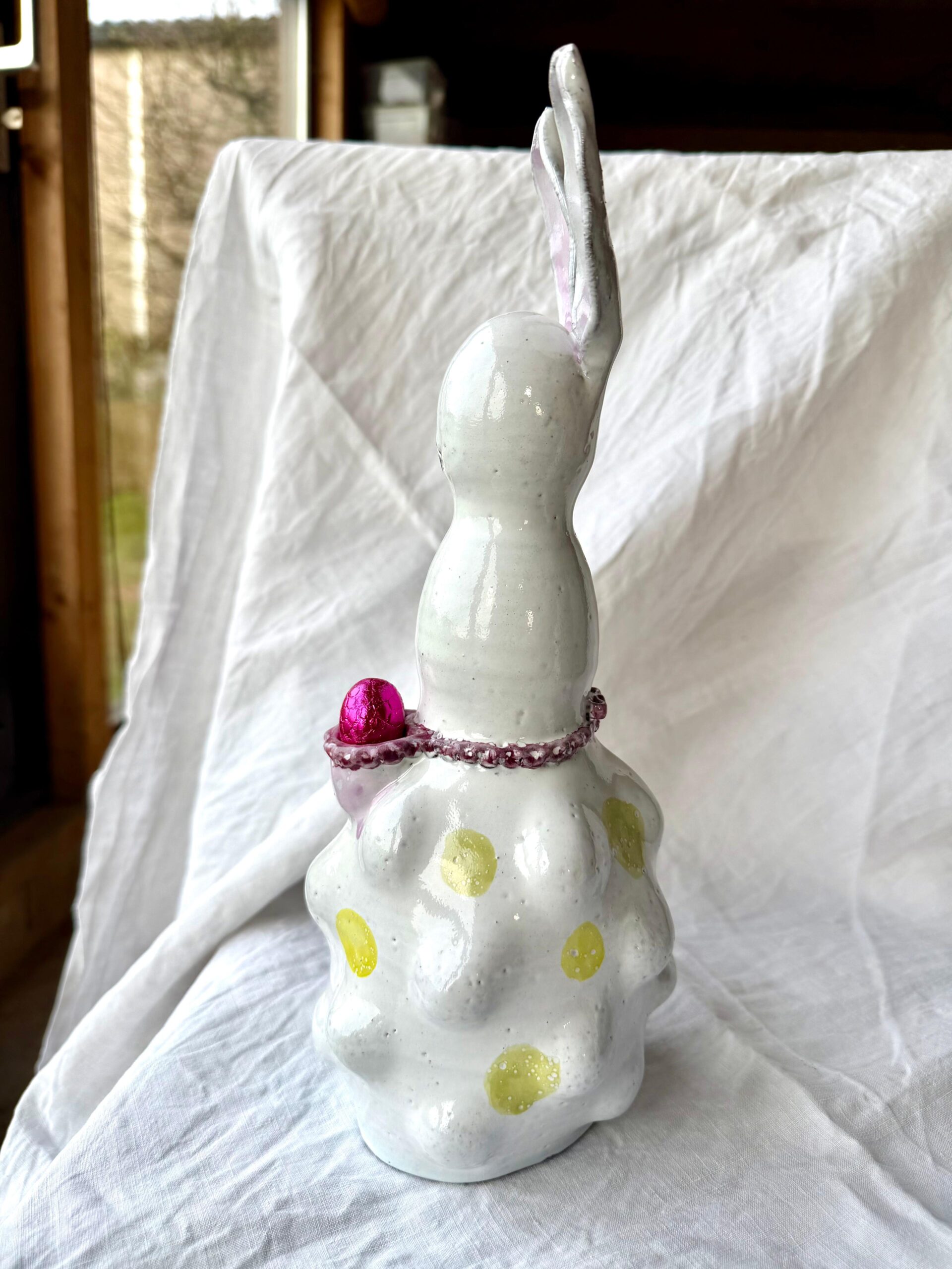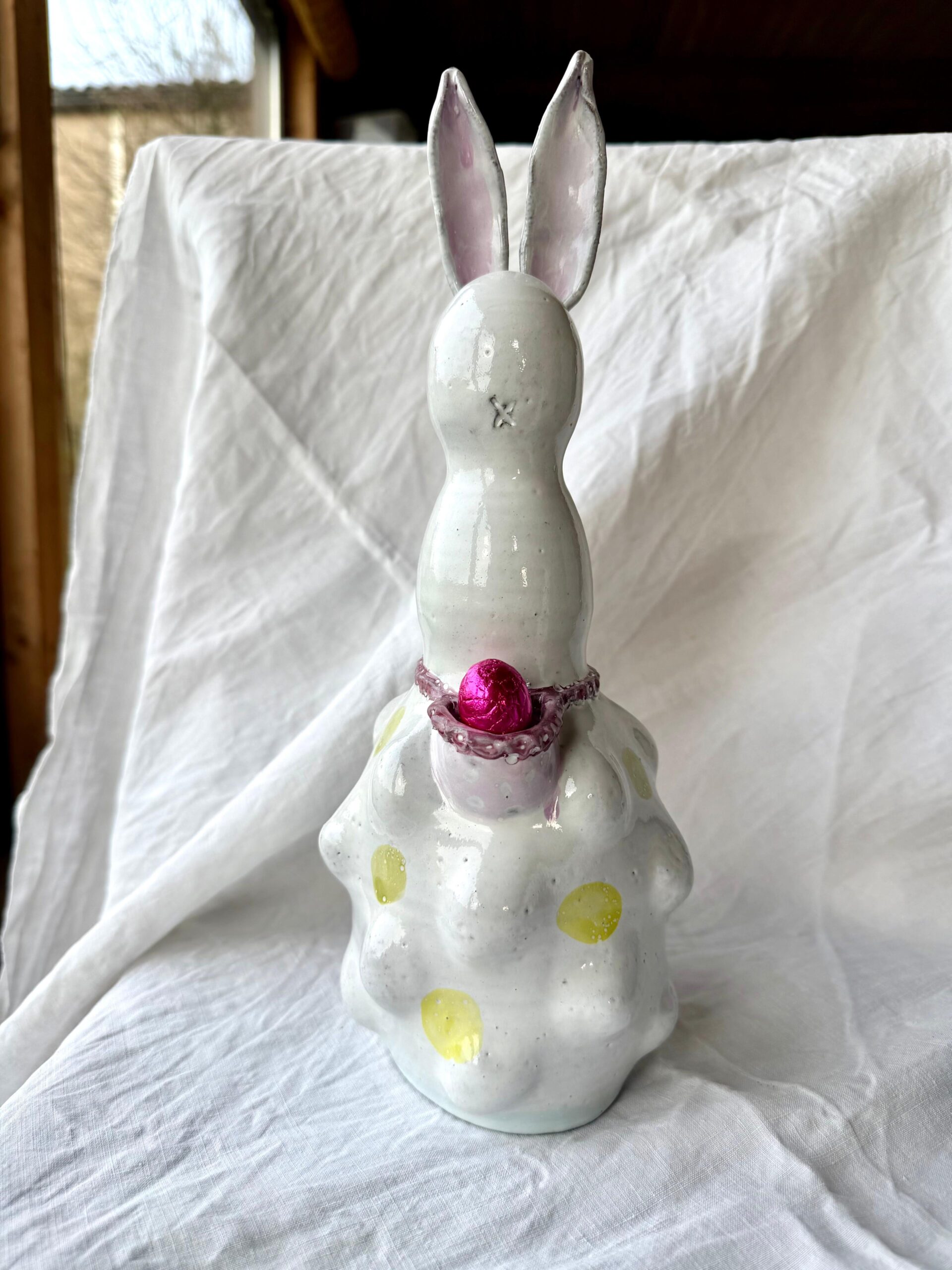 The ceramic product is made from black clay by hand, than glazed white, handpainted with green, yellow, pink, purple, is perfect in its imperfection. It’s possible to put a small flower or little chocolate eggs in the basket from the bunny.