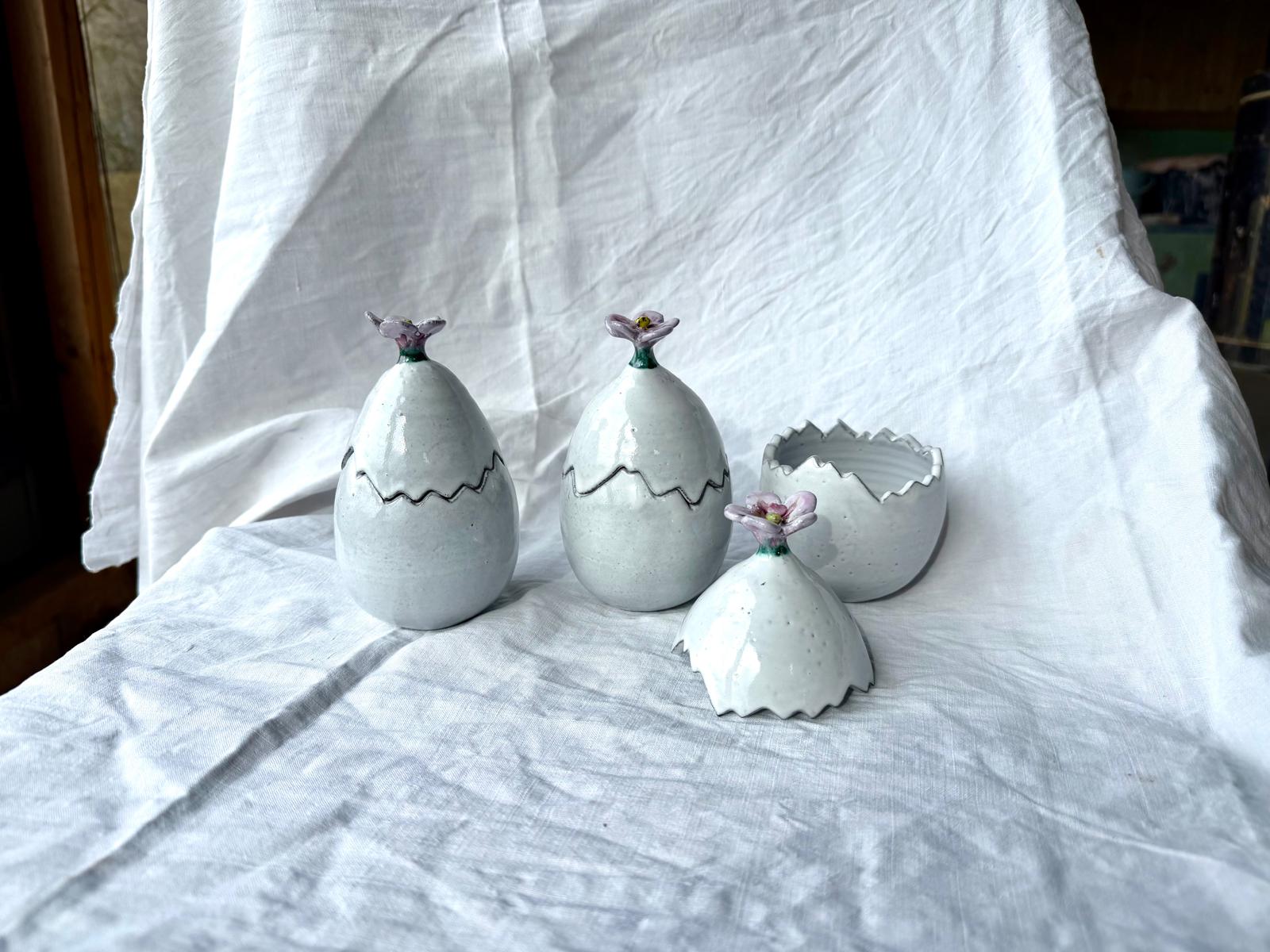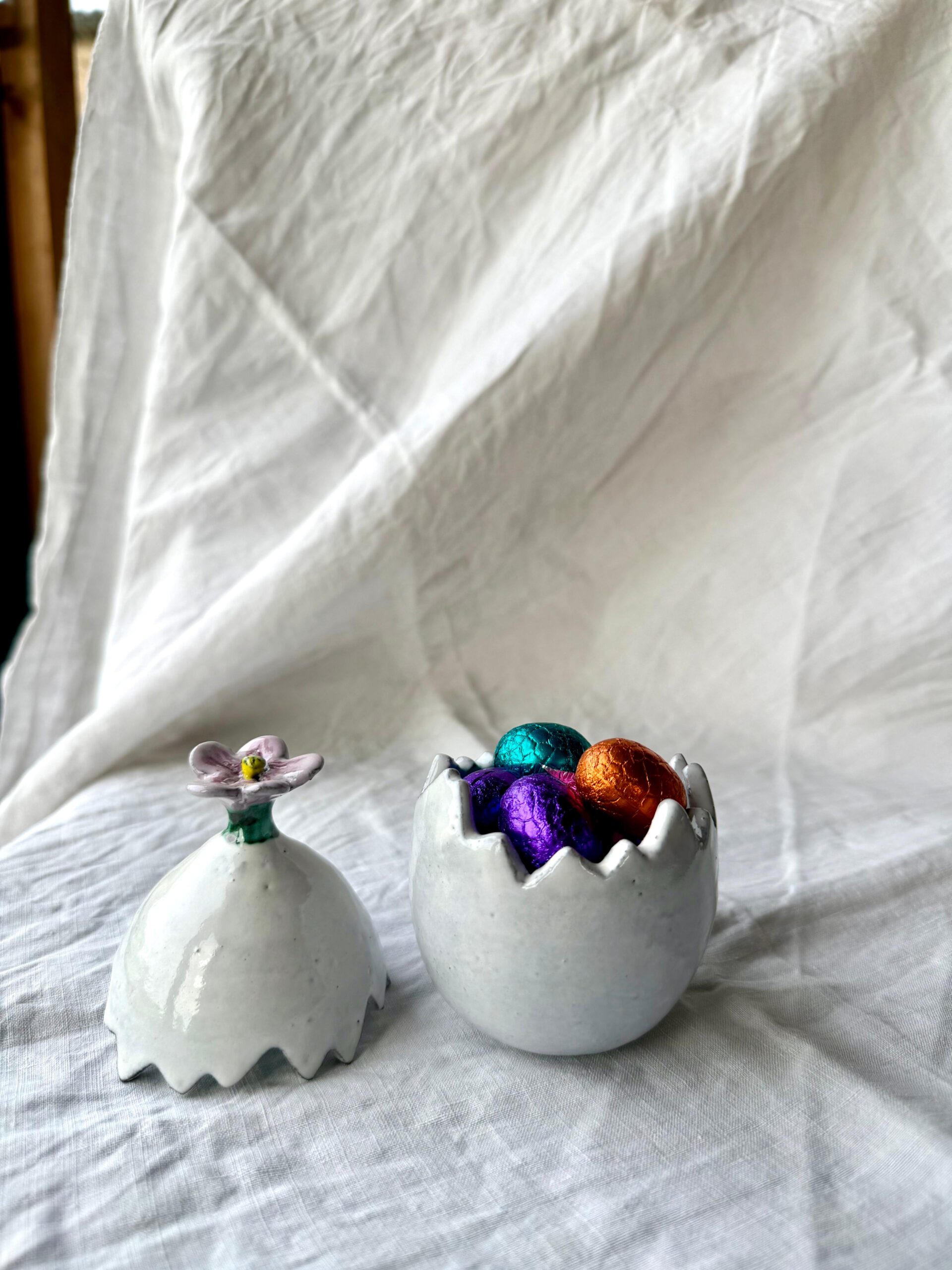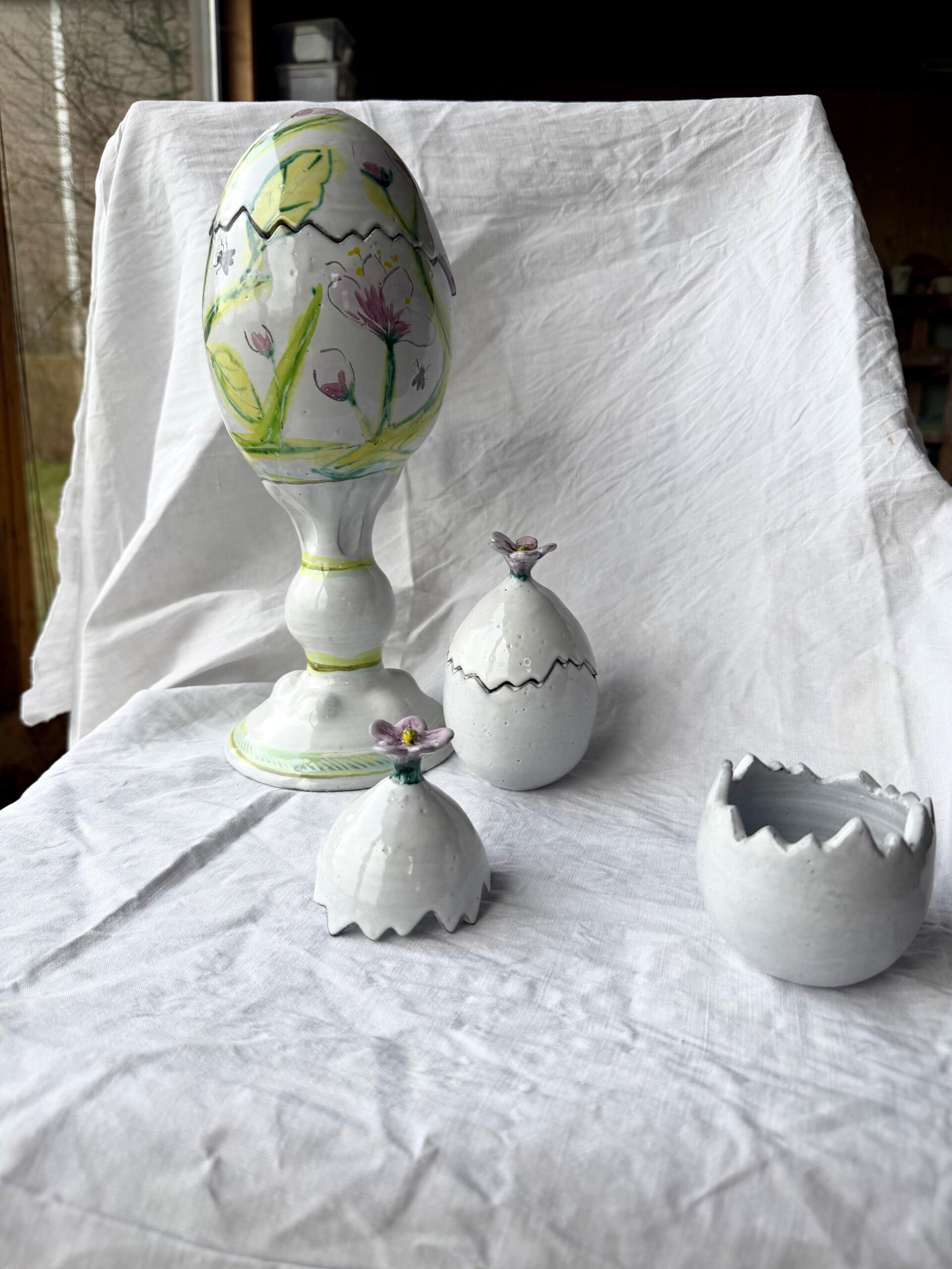 The ceramic product is made from black clay by hand, than glazed white, handpainted with green, yellow, pink, purple, is perfect in its imperfection. It’s possible to put little flowers or chocolate egg’s in the egg.