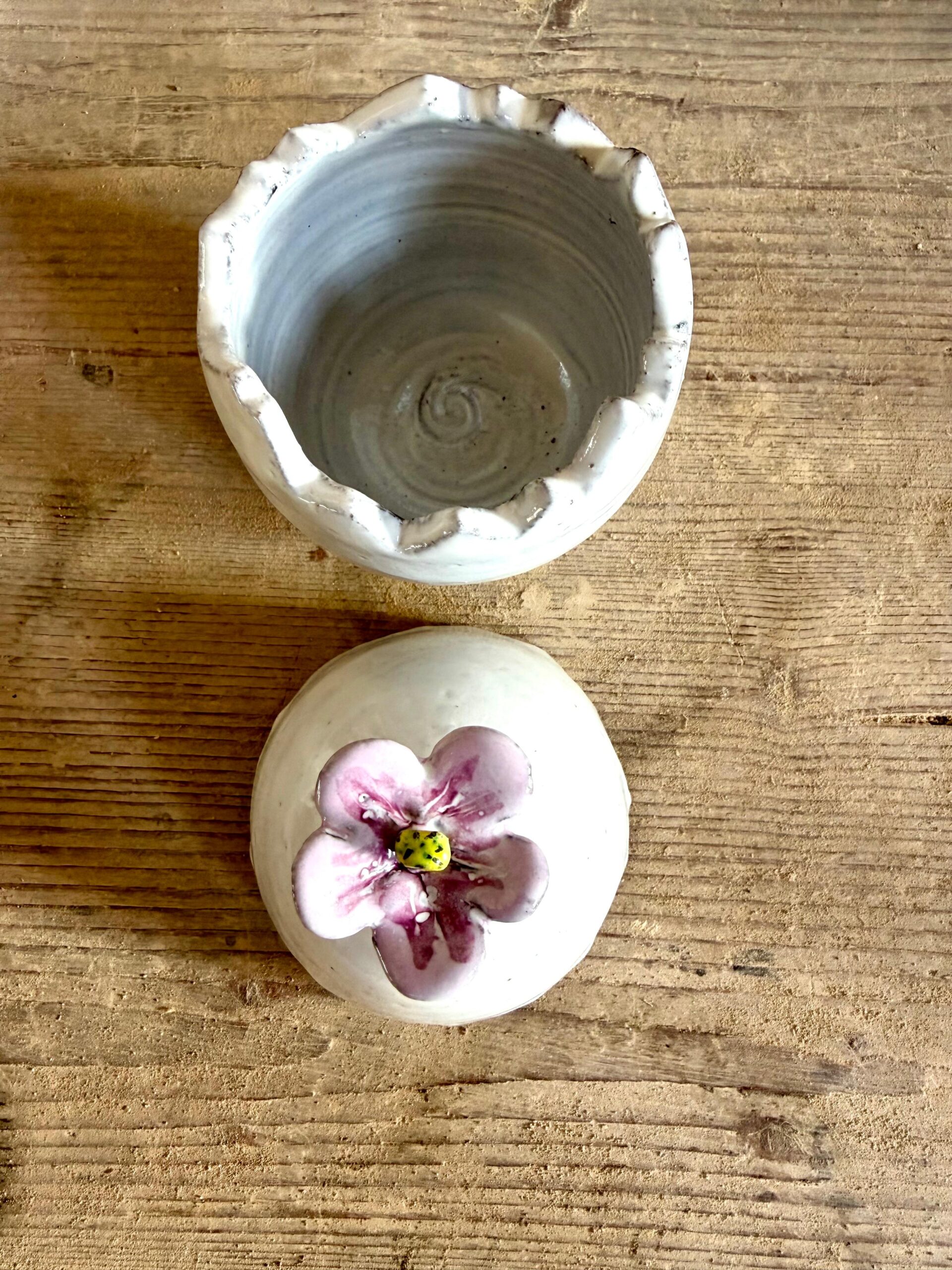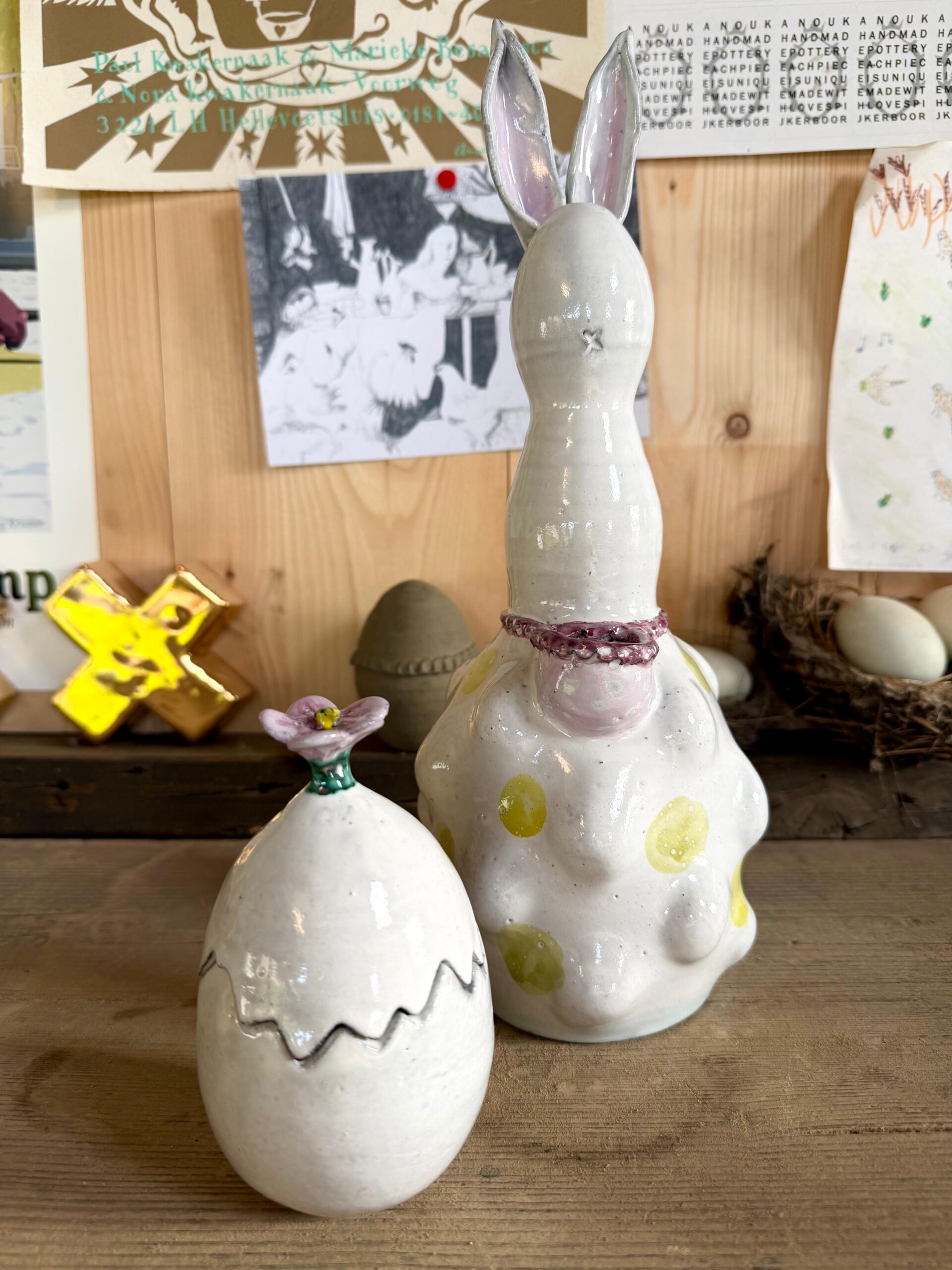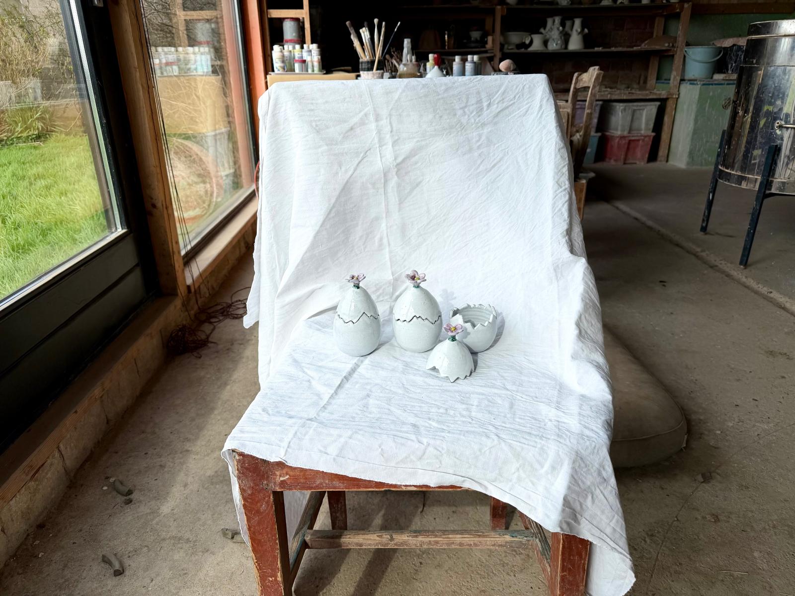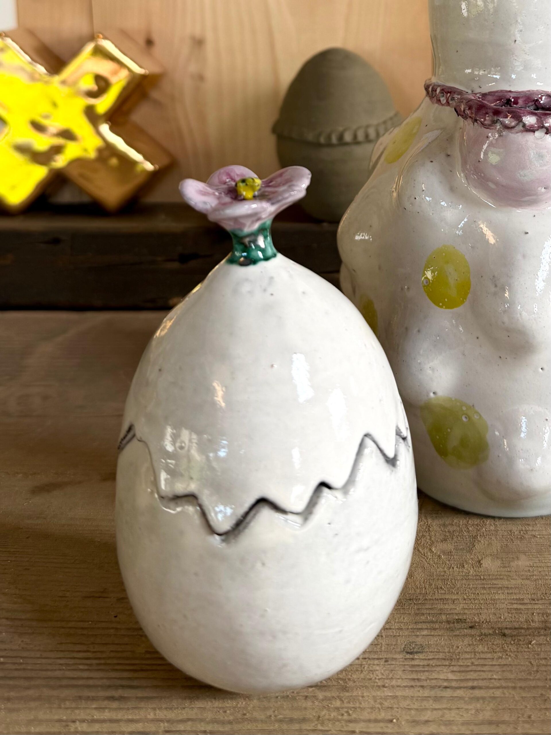 The ceramic product is made from black clay by hand, than glazed white, handpainted with green, yellow, pink, purple, is perfect in its imperfection. It’s possible to put little flowers or chocolate egg’s in the egg.
