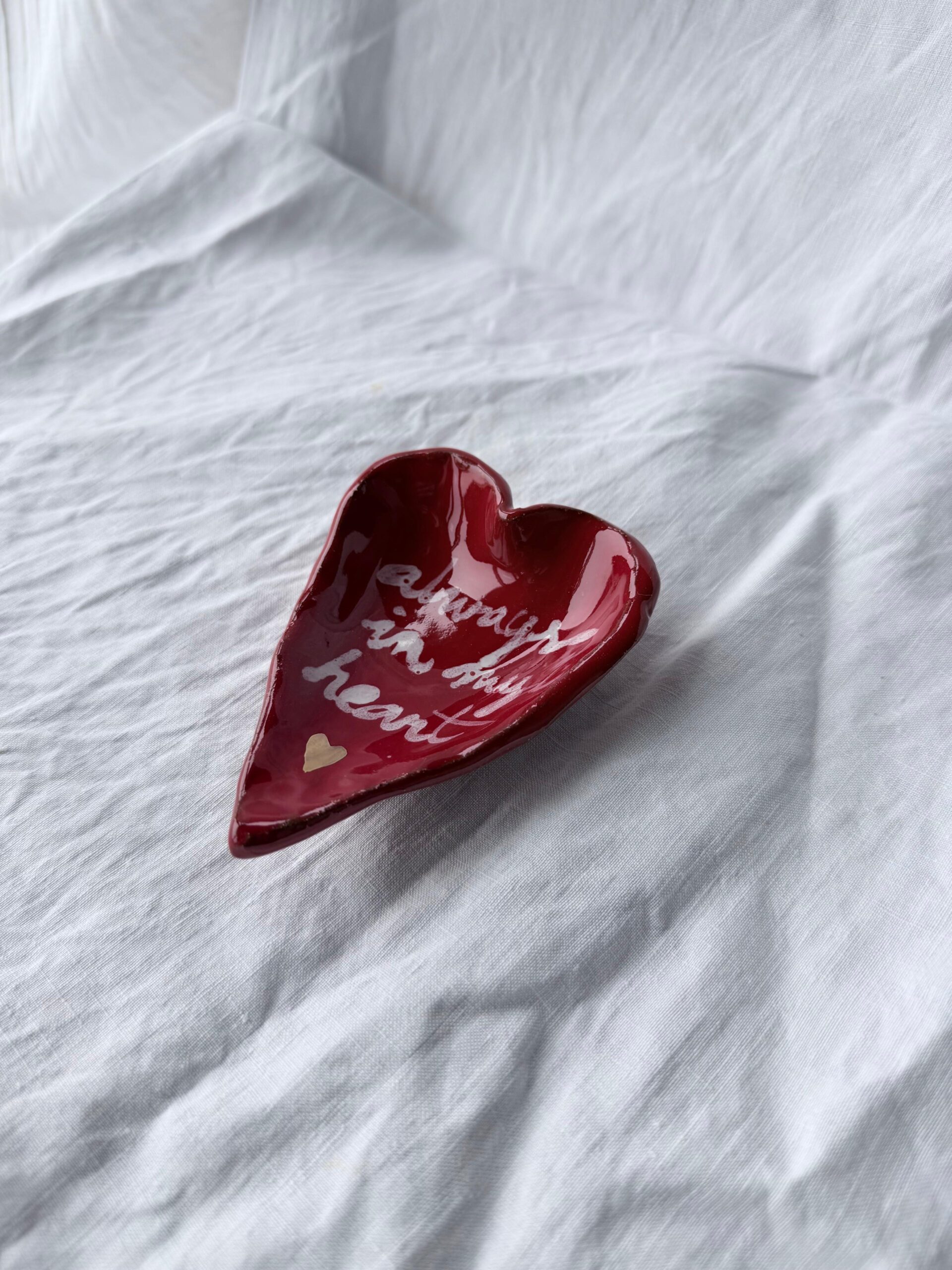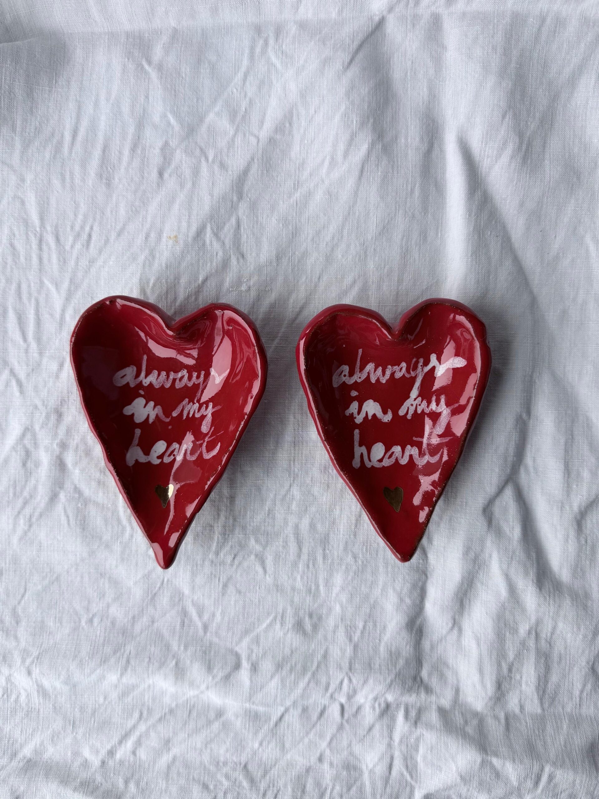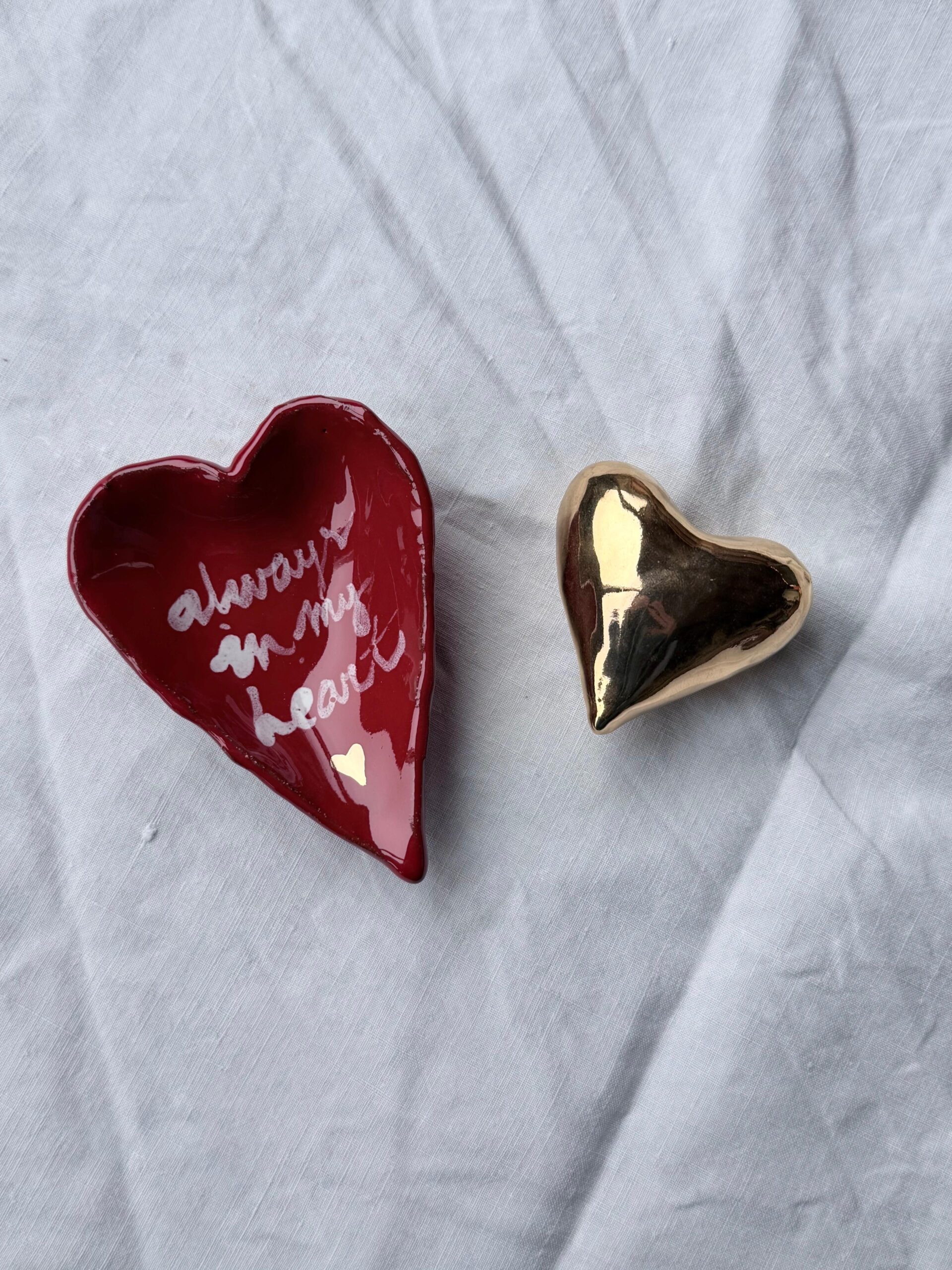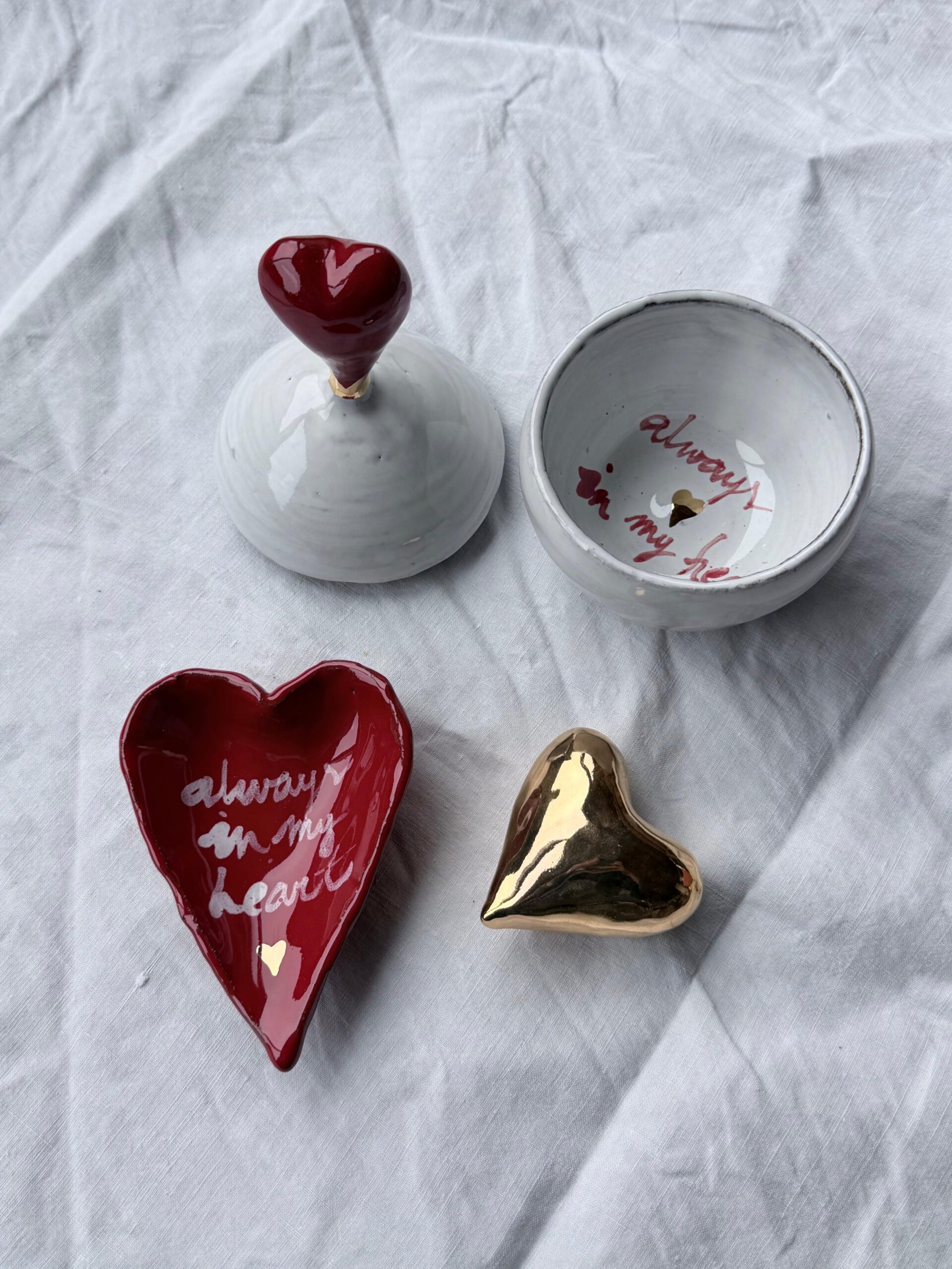 The ceramic product is made from black clay by hand, then glazed red, hand painted with white and 24 karat gold, is perfect in its imperfection.
